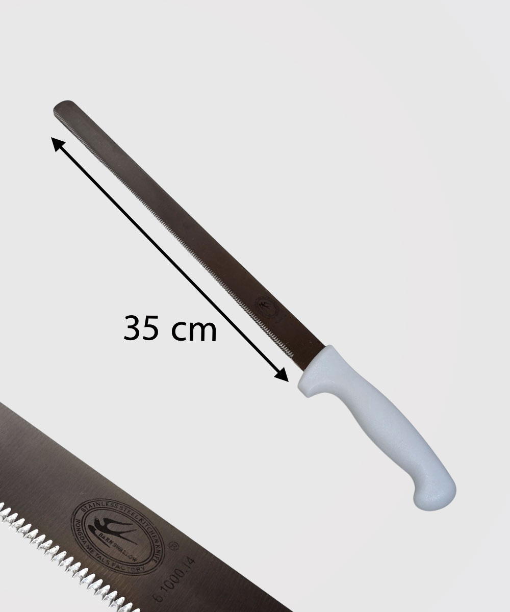 چاقو دنده ریز 35 سانت طرح پرستو برای برش انواع کیکهای اسفنجی، نان، شیرینیهای رولتی و خمیرهای نرم طراحی شده است. دندانههای ریز تیغه باعث میشود هنگام برش، بافت کیک له نشود و برشها کاملاً تمیز و یکنواخت باشند. این ویژگی برای قنادان و هنرجویان آموزش پخت شیرینی بسیار ارزشمند است.